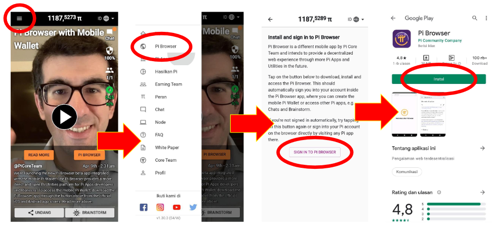 Silahkan ikuti panduan yang telah dibuat pada gambar di atas, bagaimana cara download pi browser yang digunakan sebagai wallet pi testnet sementara.